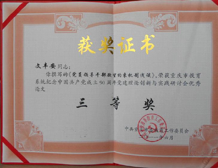 2011年6月文丰安副教授撰写的《党员领导干部欲望约束机制浅谈》获重庆市教育系统纪念中国共产党成立90周年党建理论创新与实践研讨会优秀论文三等奖.