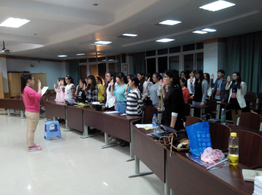 首先由会长胡秋琴致辞,她为大家详细地讲述了社团的基本情况,创始初衷以及未来的活动等内容;接着李双副会长带领全体成员起立,进行入会宣誓;宣誓之后,各部长介绍各自部门职责;最后曹亚丽副会长向大家讲述了她参加暑期廉洁领袖夏令营活动的心得,会员表现出浓厚的兴趣。
