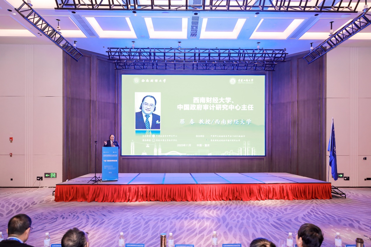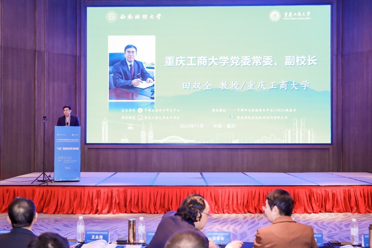 为深入学习贯彻党的二十届四中全会精神,探索进一步全面深化改革背景下中国自主审计知识体系构建问题,推动审计学科专业发展和新时代审计人才培养质量提升,2025年11月21-22日,由中国政府审计研究中心主办、重庆工商大学会计学院、重庆政府预算绩效管理与审计治理研究中心、重庆市廉政建设与审计治理研究中心承办的“第十四届审计理论创新发展论坛暨CCGAR2025年学术会议”以线下线上相结合的方式在重庆隆重召开。重庆工商大学党委常委、副校长田双全、审计署审计科研所所长、中国审计学会副会长兼秘书长刘力云、中国政府审计研究中心主任蔡春等出席开幕式并致辞。来自全国200余所高校、企事业单位的知名专家、学者和师生代表700余人参加会议。本次会议设有开幕式、青年学者论坛暨研究生主题论坛、审计学科与专业建设专题论坛、主题报告、平行分论坛及闭幕式等环节。开幕式由重庆工商大学会计学院院长钟廷勇主持。