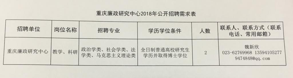重庆廉政研究中心是重庆市人文社会科学重点研究基地。现因工作需要,经学校同意,招聘研究员两名,详情如下: