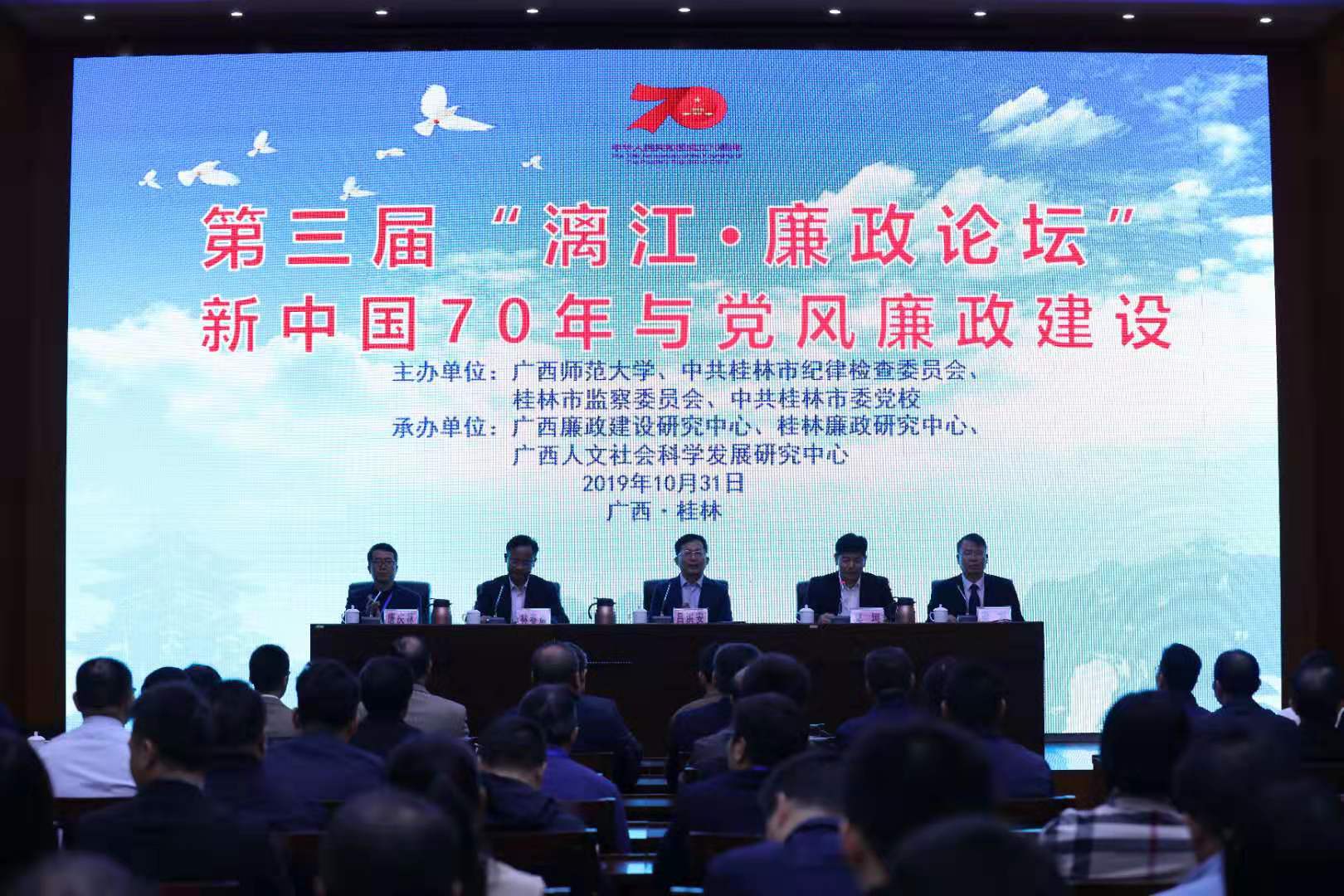 10月31日,第三届“漓江·廉政论坛”在桂林举行。论坛由广西师范大学、中共桂林市纪律检查委员会、桂林市监察委员会、中共桂林市委党校主办;广西廉政建设研究中心、桂林廉政研究中心、广西人文社会科学发展研究中心承办。桂林市委常委、纪委书记、监委主任吕洪安,广西师范大学党委常委、纪委书记莫坷,广西师范大学党委常委、副校长、广西廉政建设研究中心主任林春逸、部分高校纪委书记以及区内外廉政理论研究专家学者、纪检监察实务工作者60多家单位的近200人应邀出席。广西师范大学党委常委、副校长林春逸、桂林市委常委、纪委书记、监委主任吕洪安分别在开幕式上致辞。