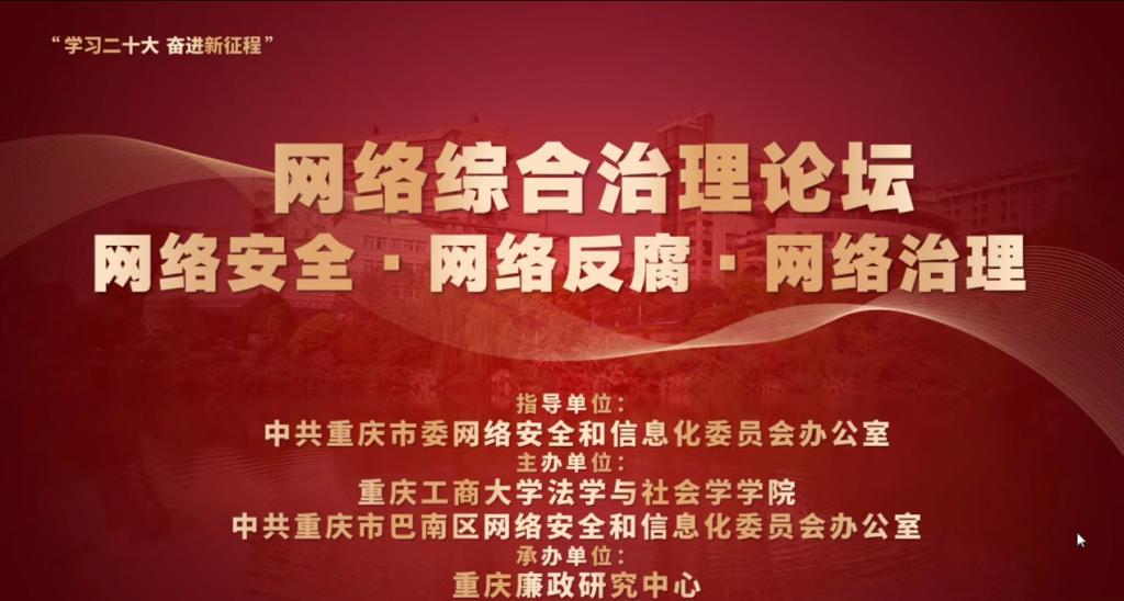 2022年12月13日(星期二)下午,由重庆工商大学法学与社会学学院与重庆市巴南区委网信办联合主办、重庆廉政研究中心承办的网络综合治理论坛顺利召开。重庆工商大学党委常委、宣传部长华杰、重庆工商大学法社学院院长、重庆廉政研究中心主任黄文、重庆市网信办网络综合治理处处长王东、巴南区委网信办主任周庆、重庆大学法学院院长黄锡生、西南政法大学法学院院长梅传强、重庆邮电大学网络空间安全与信息法学院院副院长黄东东、重庆警察学院纪委副书记王树福、西南大学法学院教授张步文、沙坪坝区网信办主任李维、南岸区委网信办主任杨雪松、渝中区委网信办主任刘书燃、璧山区委网信办主任江波等专家领导,以及廉政中心研究员田熹文、王璐等,重庆工商大学法社学院各专业研究生、各区网信办工作人员,共150余人参与了本次研讨会,论坛由重庆工商大学法学与社会学学院院长、重庆廉政研究中心主任黄文教授主持。